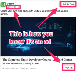Bạn có thể thấy chữ “Sponsored” ngay bên dưới tên của Fanpage và nút “Like Page” trên góc phải. Cuối cùng là nút CTA – Signup. Những bài đăng thường sẽ không có những cài đặt hiển thị như thế.